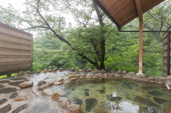 無色透明の肌あたりやわらかな湯は、自家源泉かけ流し。露天風呂の近くを流れる多田野川のせせらぎや、周囲の自然を満喫しながら、ゆっくりと入浴できる。